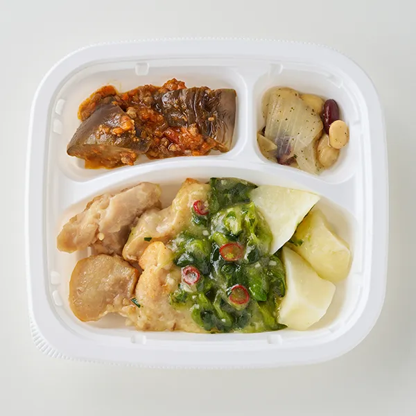鶏肉と菜の花のアーリオ・オーリオ(ローストチキン(鶏肉、でん粉、植物性たん白、ぶどう糖、食塩、酵母エキス)(中国製造)、ゆでじゃがいも、菜の花、オリーブオイル、ニンニク、上白糖、食塩、粉末調味料、鷹の爪)、ナスのトマトソース(揚げ茄子、牛肉、トマトソース、玉ねぎ、人参、オリーブオイル、白ワイン、食塩)、大豆・玉葱・パセリのサラダ(玉ねぎ、大豆水煮、赤いんげん豆、オリーブオイル、食塩、ドライパセリ)/pH調整剤、キシロース、増粘多糖類、ポリリン酸Na、調味料(アミノ酸等)、塩化Ca、酸化防止剤(V.C)、(一部に小麦・牛肉・大豆・鶏肉・ゼラチンを含む)