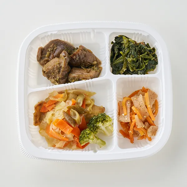 アジの南蛮漬け(あじの竜田揚げ(あじ、でん粉、しょうゆ、小麦粉、しょうが、砂糖、みりん)、玉ねぎ、長葱、いんげん、人参、食用大豆油、醸造酢、上白糖、醤油、食用調合油、本みりん、風味調味料、食塩)、茄子の煮びたし(揚げ茄子(中国製造)、小葱、醤油、上白糖、生姜、乾燥大根パウダー)、こんにゃくきんぴら(こんにゃく、人参、食用調合油、煮物つゆ、白ごま、上白糖、ナンプラー、食塩)、ほうれん草のおかか和え(ほうれん草、煮物つゆ、鰹節、食塩)、ブロッコリーソテー(ブロッコリー、食用調合油、コンパウンドバター、食塩、白コショウ)/安定剤(加工澱粉)、調味料(アミノ酸等)、pH調整剤、増粘多糖類、水酸化カルシウム、着色料(カラメル、カロチン)、乳化剤、香料、(一部に小麦・乳成分・ごま・大豆を含む)