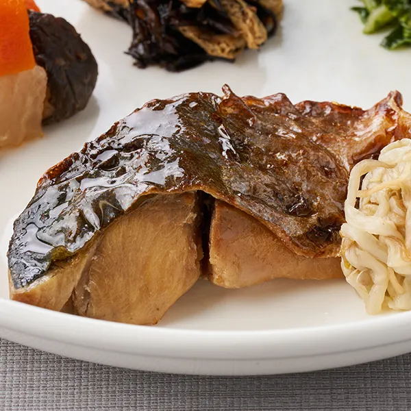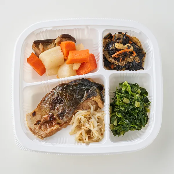 ブリの照焼き、大根と椎茸の煮物、青菜炒め、ひじき煮、もやしのナムル