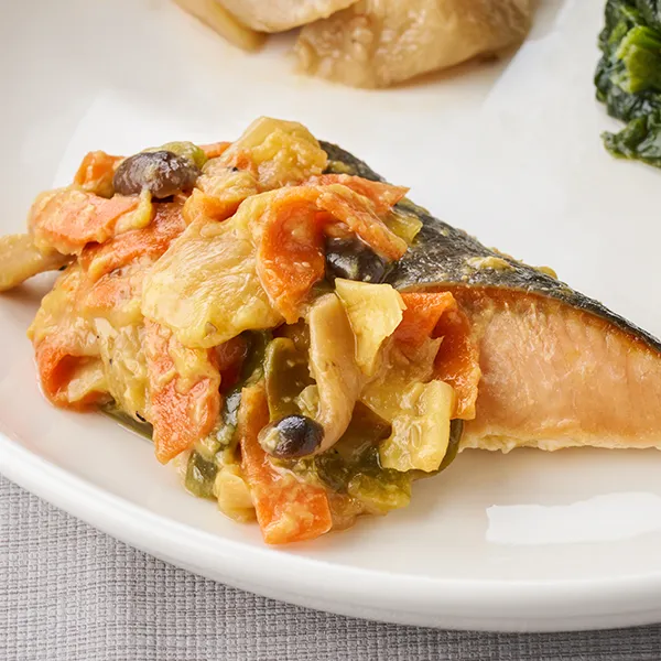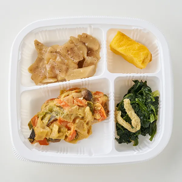 マスのちゃんちゃん焼き(マス切身(ベトナム製造)、キャベツ、ピーマン、ぶなしめじ、合わせみそ、人参、コンパウンドバター、ニンニク、清酒、本みりん、上白糖、黒コショウ)、鶏ごぼう(スチームチキン、ごぼう、こんにゃく、煮物つゆ、食用調合油、上白糖、白ごま、食塩)、ほうれん草のおひたし(ほうれん草、油揚げ、醤油、食塩、風味調味料)、だし巻き玉子(鶏卵、砂糖、しょうゆ、発酵調味液、でん粉、果糖ブドウ糖液糖、食塩、リンゴ酢、大豆油)/加工澱粉、安定剤(加工澱粉)、pH調整剤、調味料(アミノ酸等)、増粘多糖類、ポリリン酸Na、水酸化カルシウム、着色料(カラメル、カロチン)、豆腐用凝固剤、乳化剤、香料、酸化防止剤(V.C)、(一部に小麦・卵・乳成分・ごま・さけ・大豆・鶏肉・りんごを含む)