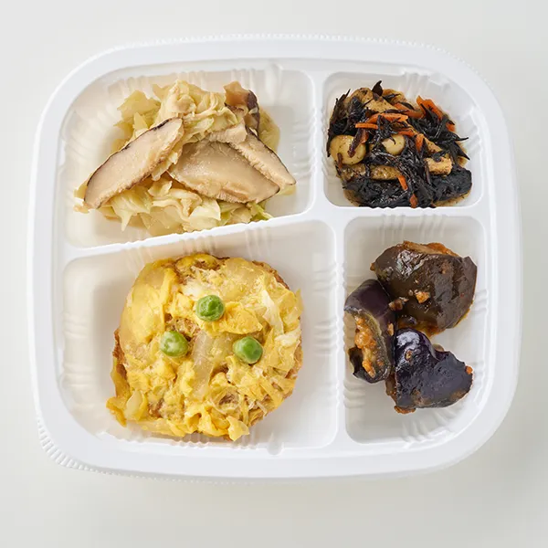 ヒレカツの玉子とじ(ヒレカツ、スクランブルエッグ、玉ねぎ、食用大豆油、グリンピース、食用調合油)、キャベツと鶏肉の味噌炒め(キャベツ(国産)、蒸し鶏、食用調合油、合わせみそ、乾燥椎茸、みりん、醤油、ニンニク、食塩)、ナスのトマトソース(揚げなす、牛肉、トマトソース、人参、玉ねぎ、オリーブオイル、白ワイン、食塩、白コショウ)、ひじき煮(油揚げ、人参、大豆水煮、煮物つゆ、ひじき、食用調合油、上白糖、食塩)/グリシン、増粘多糖類、酢酸Na、調味料(アミノ酸等)、リン酸塩(Na)、豆腐用凝固剤、pH調整剤、着色料(カラメル)、加工澱粉、酸化防止剤(V.C)、塩化Ca、甘味料(甘草、ステビア)、(一部に小麦・卵・乳成分・牛肉・大豆・鶏肉・豚肉・ゼラチンを含む)