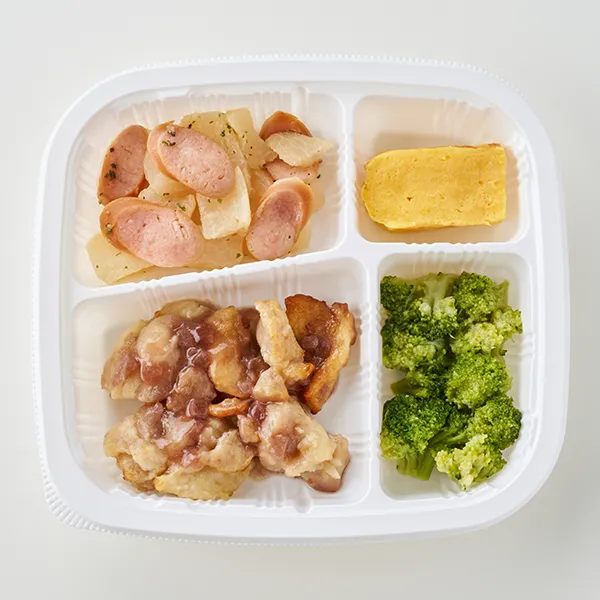 鶏肉の赤ワインソース(ローストチキン(鶏肉、でん粉、植物性たん白、ぶどう糖、食塩、酵母エキス)(中国製造)、赤ワイン、玉ねぎ、醤油、醸造酢、ハチミツ、ニンニク、コンパウンドバター)、大根とウインナーのコンソメ煮(大根、ウインナーソーセージ、乾燥スープ(コンソメ)、ドライパセリ、黒コショウ)、ブロッコリーソテー(ブロッコリー、食用調合油、コンパウンドバター、食塩、白コショウ)、だし巻き玉子(鶏卵、砂糖、しょうゆ、発酵調味液、でん粉、果糖ブドウ糖液糖、食塩、リンゴ酢、大豆油)/加工澱粉、調味料(アミノ酸等)、pH調整剤、キシロース、リン酸塩(Na)、増粘多糖類、酸化防止剤(V.C)、乳化剤、香料、発色剤(亜硝酸Na)、着色料(コチニール、カロチン、カラメル)、酸味料、(一部に小麦・卵・乳成分・牛肉・大豆・鶏肉・豚肉・りんご・ゼラチンを含む)