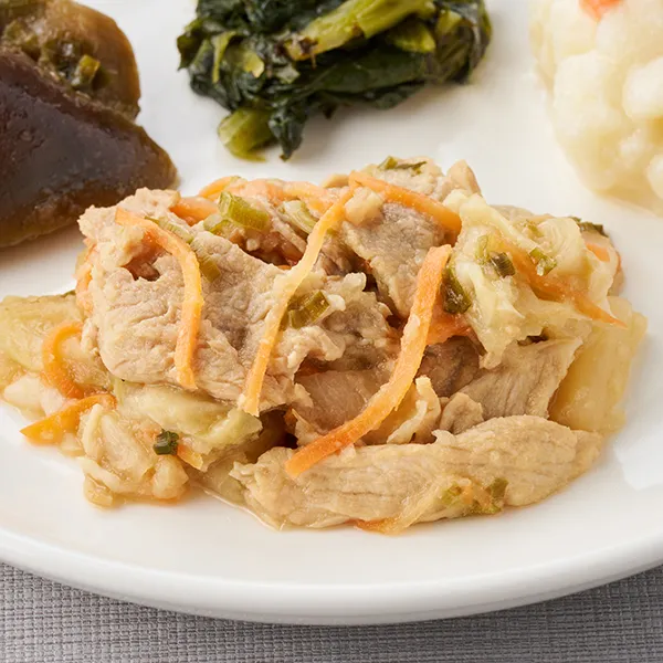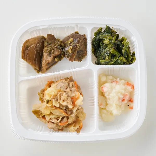 豚しゃぶ(豚肉加工品、キャベツ、人参、煮物つゆ、えのき、味付けぽん酢、醸造酢、小葱、乾燥大根パウダー)、茄子の煮びたし(揚げ茄子(中国製造)、小葱、醤油、上白糖、生姜、乾燥大根パウダー)、ポテトサラダ(じゃがいも、半固体状ドレッシング、にんじん、たまねぎ、香辛料)、小松菜の磯辺和え(小松菜、煮物つゆ、食用調合油、海苔、食塩)/加工澱粉、調味料(アミノ酸等)、増粘多糖類、焼成Ca、着色料(カラメル)、酵素、酸味料、(一部に小麦・卵・乳成分・ごま・さば・大豆・鶏肉・豚肉・ゼラチンを含む)