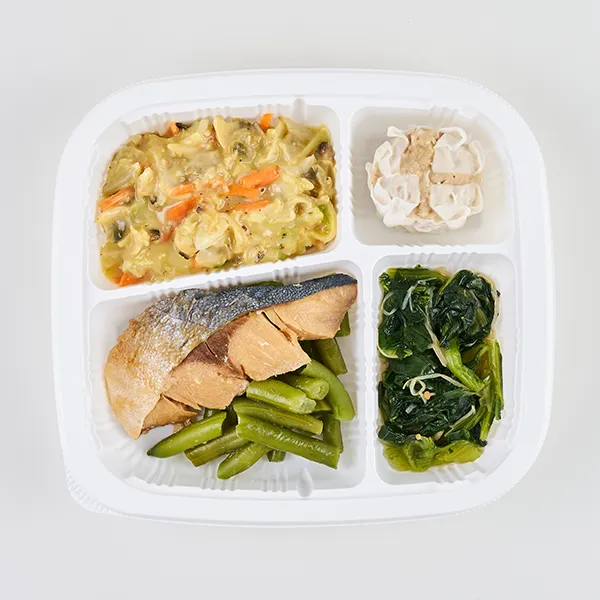 あさりと野菜の炒め煮(あさり、白菜、人参、食用調合油、生姜、食塩、風味調味料)、ブリの生姜煮(ぶり(韓国)、醤油、砂糖、みりん、清酒、水飴、生姜、馬鈴薯澱粉)、小松菜の柚子和え(小松菜、えのき、煮物つゆ、ゆず、食塩)、肉シューマイ(たまねぎ、鶏肉、小麦粉、豚脂、粒状植物性たん白、ゼラチン、砂糖、豚肉、食塩、しょうゆ、卵白、たん白加水分解物、粉末状植物性たん白、ぶどう糖、香辛料、大豆粉、ラード、チキンエキス、ポークエキス)、インゲン煮(インゲン、醤油、食塩、風味調味料)/酢酸塩(Na、Ca)、調味料(アミノ酸等)、pH調整剤、増粘多糖類、グリシン、グリセリンエステル、着色料(カラメル)、(一部に小麦・卵・大豆・鶏肉・豚肉・ゼラチンを含む)