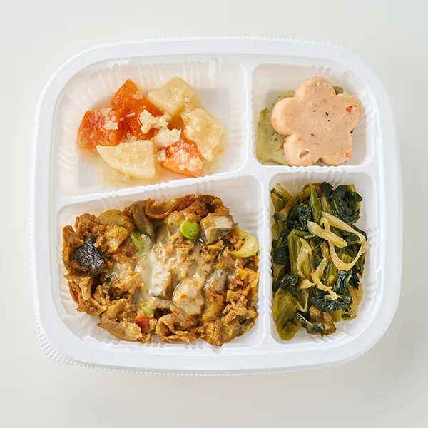 豚肉と茄子のカレーミートソース(豚肉加工品、玉ねぎ、揚げなす、豚肉加工品、トマトソース、プロセスチーズ、枝豆、カレールウ、食用調合油、醤油、食塩、白コショウ)、大根と人参のそぼろ煮(大根、人参、スチームチキン、食用調合油、煮物つゆ、生姜、食塩、ナンプラー)、小松菜とザーサイの炒め物(小松菜(中国)、味付ザーサイ、食用調合油、オイスターソース、清酒、醤油、食塩)、彩りしんじょう(豆腐、魚肉すり身、野菜(にんじん、たまねぎ、えだまめ、ほうれん草)、植物油、チキンブイヨン、豆乳、水煮れんこん、粉末状植物性たん白、砂糖、食塩、粉末調味料、かつお風味調味料、ひじき)/加工澱粉、調味料(アミノ酸等)、着色料(カラメル、紅麹、紅花黄、クチナシ、カロチノイド)、pH調整剤、乳化剤、セルロース、糊料(増粘多糖類、加工澱粉)、ポリリン酸Na、酸味料、焼成Ca、酸化防止剤(エリソルビン酸Na)、塩化Ca、保存料(ソルビン酸K)、香料、香辛料抽出物、(一部にえび・小麦・乳成分・牛肉・ごま・さば・大豆・鶏肉・豚肉・りんごを含む)