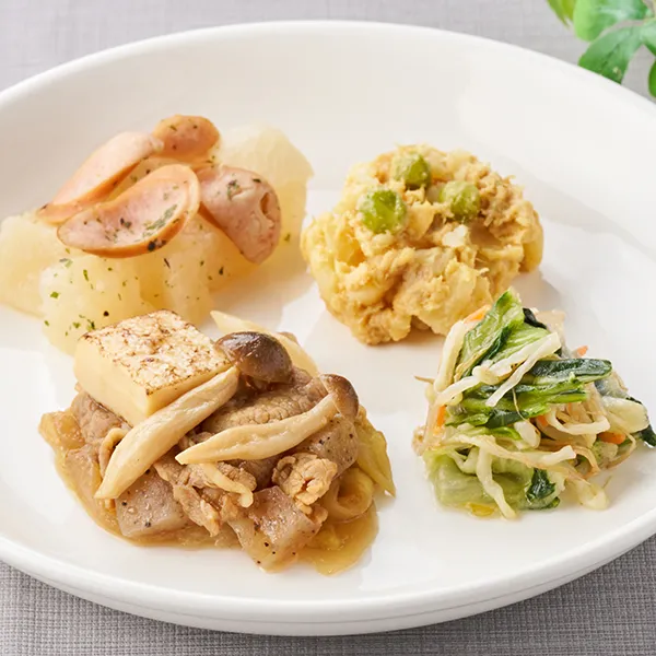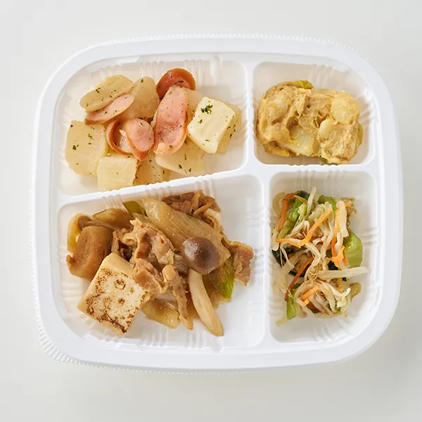 大根とウインナーのコンソメ煮(大根(国産)、ウインナーソーセージ、乾燥スープ(コンソメ)、ドライパセリ、黒コショウ)、肉豆腐(牛肉加工品、玉ねぎ、白菜、こんにゃく、焼き豆腐、煮物つゆ、ぶなしめじ、長葱、食用調合油、生姜、三温糖、焼麩、ナンプラー)、チンゲン菜ともやしのナムル(もやし、チンゲン菜、人参、食用調合油、醤油、食塩)、ポテトのツナマヨカレーソース(ゆでじゃがいも、半固体状ドレッシング、ツナフレーク、グリーンピース、食用調合油、カレールウ、上白糖、香味食用油、食塩)/加工澱粉、調味料(アミノ酸等)、糊料(加工澱粉、増粘多糖類)、pH調整剤、リン酸塩(Na)、着色料(カラメル、コチニール、カロチン)、豆腐用凝固剤、焼成Ca、水酸化カルシウム、酸化防止剤(V.C)、発色剤(亜硝酸Na)、香料、乳化剤、酸味料、香辛料抽出物、(一部に小麦・卵・乳成分・牛肉・ごま・大豆・鶏肉・豚肉・りんご・ゼラチンを含む)