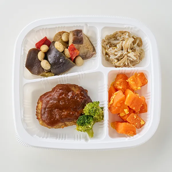 ハンバーグデミグラスソース、大豆・ナス・ピーマンの温サラダ、人参と玉子の炊き合わせ、もやしのナムル、茹でブロッコリー