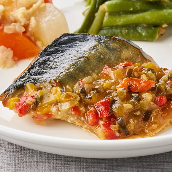香味野菜で仕上げた黒酢ソースで、脂がのったサバをさっぱりとお召し上がりください。