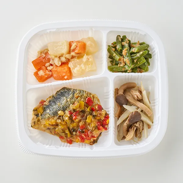 サバの香味野菜ソース、大根と人参のそぼろ煮、インゲンのピーナッツ和え、きのこ生姜炒め