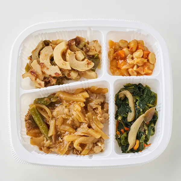 牛肉のケイジャンソース炒め(牛肉加工品、じゃが芋、玉ねぎ、インゲン、食用調合油、ケイジャンオイルソース、清酒、みりん、粉末調味料、醤油)、ちくわ玉葱ピーマンのきんぴら(竹輪、玉ねぎ、ピーマン、本みりん、醤油、食用調合油、鰹節、白ごま)、青菜のソテー(ほうれん草(中国)、ぶなしめじ、人参、食用調合油、ベーコン、醤油、ニンニク、粉末調味料、白コショウ)、野菜入りトマトビーンズ(大豆水煮、玉ねぎ、人参、トマトソース、オリーブオイル、ベーコン、白ワイン、ニンニク、チキンブイヨン、食塩)/加工澱粉、調味料(アミノ酸等)、増粘多糖類、焼成Ca、酸化防止剤(アスコルビン酸(Na)、V.E)、リン酸塩(Na)、塩化Ca、ソルビット、くん液、発色剤(亜硝酸Na)、着色料(コチニール、カロチノイド、カラメル)、香料、乳化剤、香辛料抽出物、(一部に小麦・卵・乳成分・牛肉・ごま・大豆・鶏肉・豚肉・ゼラチンを含む)