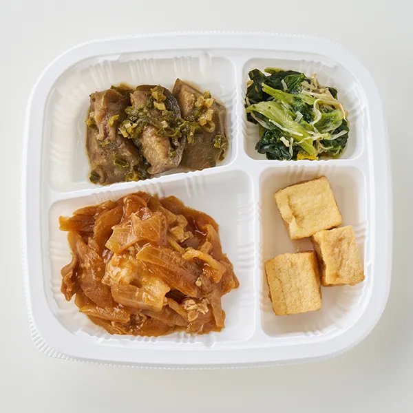 豚肉の生姜焼き(玉ねぎ(中国)、豚肉加工品、食用調合油、甜麺醤、生姜、醤油、清酒、食塩)、茄子の煮びたし(揚げ茄子、小葱、醤油、上白糖、生姜、乾燥大根パウダー)、厚揚げの煮物(厚揚げ、醤油、上白糖、風味調味料、食塩)、小松菜の柚子和え(小松菜、えのき、煮物つゆ、ゆず、食塩)/安定剤(加工澱粉)、加工澱粉、豆腐用凝固剤、調味料(アミノ酸等)、着色料(カラメル)、増粘多糖類、焼成Ca、酸味料、(一部に小麦・落花生・ごま・大豆・豚肉を含む)