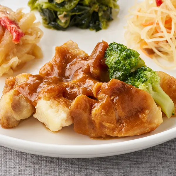 ジューシーに焼き上げた鶏肉にコクのある特製デミグラスソースをかけました。