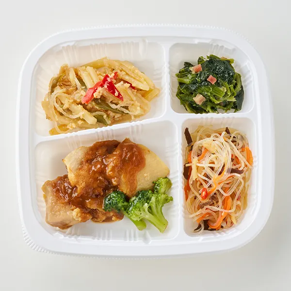 デミグラスチキン(ローストチキン(中国製造)(鶏肉、でん粉、植物性たん白、ぶどう糖、食塩、酵母エキス)、デミグラスソース、オニオンソテー、赤ワイン、醤油、食用調合油、粉末調味料、ウスターソース、食塩、コンパウンドバター、ニンニク)、糸コンとじゃが芋の味噌炒め(じゃが芋、糸こんにゃく、ピーマン、赤ピーマン、白みそ、食用調合油、白ごま、本みりん、ニンニク)、ほうれん草のベーコン和え(ほうれん草、ベーコン、オリーブオイル、ニンニク、食塩、白コショウ)、中華風春雨サラダ(春雨、人参、たけのこ水煮、赤ピーマン、和風醤油ごまドレッシング、食用調合油、きくらげ、白ごま、粉末調味料、食塩)、ブロッコリーのバター風味(ブロッコリー、香味食用油、乾燥スープ(コンソメ)、食塩)/加工澱粉、増粘剤(加工澱粉、増粘多糖類)、pH調整剤、キシロース、調味料(アミノ酸等)、リン酸塩(Na)、着色料(カラメル、カロチン)、水酸化カルシウム、酸化防止剤(V.C)、乳化剤、香料、酸味料、くん液、発色剤(亜硝酸Na)、(一部に小麦・卵・乳成分・牛肉・ごま・大豆・鶏肉・豚肉・りんご・ゼラチンを含む)