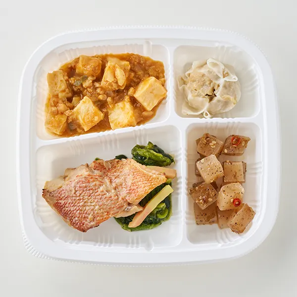 マーボー豆腐(冷凍豆腐、豚肉加工品、中華調味料(しょうゆ、豆板醤、かきエキス、砂糖、米みそ、にんにく、食塩、醸造酢、香味食用油、発酵調味料、しょうが、トウチ醤、ごま油、魚醤)、玉ねぎ、長葱、食用調合油、食塩)、赤魚の塩麹焼き(赤魚(アメリカ)、米、食塩、米麹)、ピリ辛こんにゃく(こんにゃく、煮物つゆ、食用調合油、鰹節、白ごま、ナンプラー、三温糖、食塩、鷹の爪)、肉シューマイ(たまねぎ、鶏肉、小麦粉、豚脂、粒状植物性たん白、ゼラチン、砂糖、豚肉、食塩、しょうゆ、卵白、たん白加水分解物、粉末状植物性たん白、ぶどう糖、香辛料、大豆粉、ラード、チキンエキス、ポークエキス)、ほうれん草の辛子和え(ほうれん草、かまぼこ、煮物つゆ、からし、食塩)/安定剤(加工澱粉)、調味料(アミノ酸等)、酢酸塩(Na、Ca)、加工澱粉、pH調整剤、豆腐用凝固剤、グリシン、増粘剤(増粘多糖類、加工澱粉)、水酸化カルシウム、ソルビット、着色料(ウコン、カラメル、コチニール、カロチノイド)、グリセリンエステル、V.C、酸味料、香辛料抽出物、(一部に小麦・卵・乳成分・ごま・大豆・鶏肉・豚肉・ゼラチンを含む)