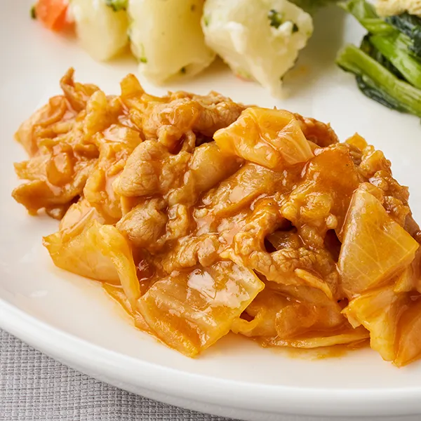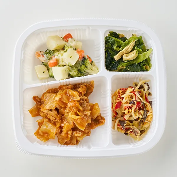 ボルシチ風(牛肉加工品、キャベツ、玉ねぎ、トマト、トマトケチャップ、オリーブオイル、上白糖、デミグラスソース、醤油、ニンニク、赤ワイン、コンパウンドバター、粉末調味料、乾燥スープ(コンソメ)、ブイヨン、ローレル)、洋風野菜のクリーム煮(牛乳、ブロッコリー、ゆでじゃがいも、人参、ホワイトソース(粉末)、ハチミツ、食塩、白コショウ)、筍と玉子の中華風炒め(赤ピーマン、たけのこ水煮、全卵、味付ザーサイ、長葱、食用調合油、きくらげ、生姜、食塩、ニンニク、豆板醤、粉末調味料、醤油、白コショウ)、小松菜のおひたし(小松菜(中国)、油揚げ、煮物つゆ、食塩)/加工澱粉、調味料(アミノ酸等)、増粘多糖類、焼成Ca、酸味料、豆腐用凝固剤、着色料(カラメル、カロチノイド)、酸化防止剤(エリソルビン酸Na)、pH調整剤、保存料(ソルビン酸K)、乳化剤、香料、香辛料抽出物、(一部に小麦・卵・乳成分・牛肉・ごま・大豆・鶏肉・豚肉・りんご・ゼラチンを含む)