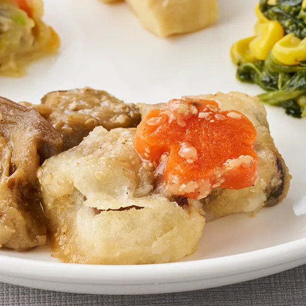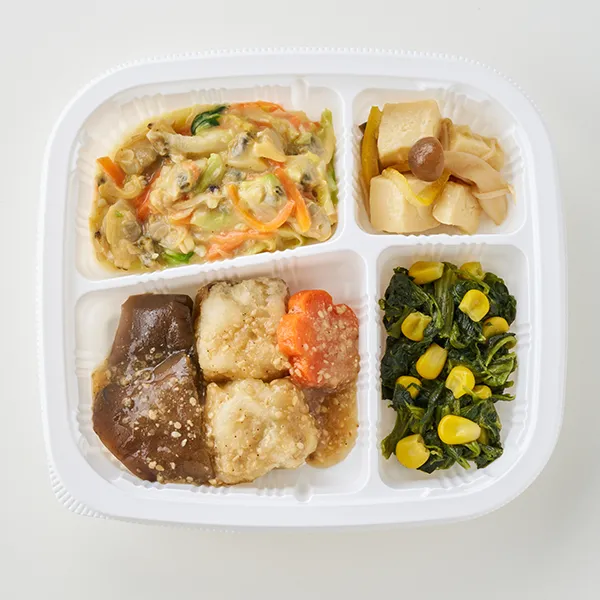 アジと茄子の胡麻味噌だれ(打粉付あじ(中国製造)、揚げナス、味噌だれ、食用大豆油、ごま和えの素、煮物つゆ、醸造酢、食塩)、あさりと野菜の炒め煮(あさり、白菜、人参、食用調合油、生姜、食塩、風味調味料)、ほうれん草のバターソテー(ほうれん草、コーン、食用調合油、コンパウンドバター、食塩、白コショウ)、豆腐の柚子あんかけ(冷凍豆腐、煮物つゆ、ぶなしめじ、えのき、ゆず)、花人参(人参、醤油、食塩、風味調味料)/増粘多糖類、調味料(アミノ酸等)、クロレラ抽出液、pH調整剤、豆腐用凝固剤、着色料(カラメル、カロチン)、乳化剤、香料、(一部に小麦・乳成分・ごま・大豆・魚醤パウダー(魚介類)を含む)