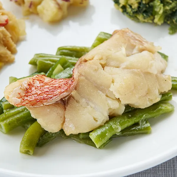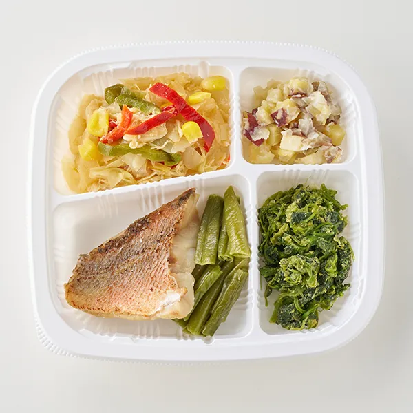 野菜の柚子胡椒炒め(玉ねぎ、キャベツ、蒸し鶏、コーン、ピーマン、赤ピーマン、食用調合油、食塩、ゆず、柚子こしょう)、赤魚の塩焼き(赤魚(アメリカ)、食塩)、ほうれん草の菜種和え(ほうれん草、全卵、煮物つゆ、食用調合油、食塩)、さつま芋サラダ(さつま芋、玉ねぎ、ヨーグルト、半固体状ドレッシング、上白糖、食塩)、インゲンソテー(インゲン、香味食用油、食塩、白コショウ)/酢酸塩(Na、Ca)、グリシン、調味料(アミノ酸等)、リン酸塩(Na)、グリセリンエステル、安定剤(増粘多糖類)、香料、着色料(カラメル、クチナシ、カロチン)、増粘剤(加工澱粉、増粘多糖類)、乳化剤、香辛料抽出物、(一部に小麦・卵・乳成分・ごま・大豆・鶏肉・りんご・ゼラチンを含む)