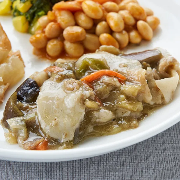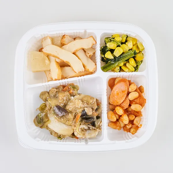 豚肉とナスの味噌炒め(揚げなす、豚肉加工品、味噌だれ、長葱、人参、ピーマン、食用調合油、醤油、食塩)、大根とさつま揚げの煮物(大根(国産)、さつま揚げ、醤油、清酒、みりん、上白糖、食用調合油、風味調味料、食塩)、大豆とソーセージのトマト煮込み(大豆水煮、ウインナーソーセージ、トマトケチャップ、玉ねぎ、トマトソース、オリーブオイル、白ワイン、ニンニク、食塩)、ほうれん草のバターソテー(ほうれん草、コーン、食用調合油、コンパウンドバター、食塩、白コショウ)/加工澱粉、調味料(アミノ酸等)、増粘多糖類、酸化防止剤(アスコルビン酸(Na))、焼成Ca、リン酸塩(Na)、pH調整剤、乳化剤、香料、発色剤(亜硝酸Na)、塩化Ca、着色料(コチニール、カロチン)、(一部に小麦・卵・乳成分・牛肉・ごま・大豆・鶏肉・豚肉・ゼラチン・魚醤パウダー(魚介類)を含む)