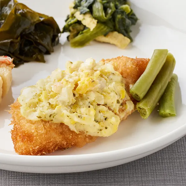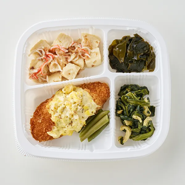 サーモンフライ(サーモンフライ(カラフトマス、パン粉、小麦粉、植物油脂、しょうゆ、でん粉、小麦粉加工品、しょうがペースト、食塩、砂糖)(国内製造)、ヨーグルト、半固体状ドレッシング、玉ねぎ、スクランブルエッグ、食用大豆油、上白糖、オリーブオイル、レモンジュース(濃縮還元)、ニンニク、食塩、ドライパセリ)、豆腐の煮やっこ(冷凍豆腐、かに風味蒲鉾、煮物つゆ、生姜、鰹節、食塩)、ほうれん草のおひたし(ほうれん草、油揚げ、醤油、食塩、風味調味料)、ワカメの青ジソサラダ(青じそドレッシング、乾燥ワカメ)、インゲン煮(インゲン、醤油、食塩、風味調味料)/加工澱粉、調味料(アミノ酸等)、豆腐用凝固剤、増粘剤(増粘多糖類、加工澱粉)、膨張剤、ピロリン酸Na、香料、着色料(紅麹、カロチノイド、カラメル)、安定剤(増粘多糖類)、乳化剤、炭酸Ca、甘味料(スクラロース)、pH調整剤、香辛料抽出物、(一部にかに・小麦・卵・乳成分・さけ・大豆・りんご・ゼラチンを含む)