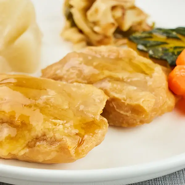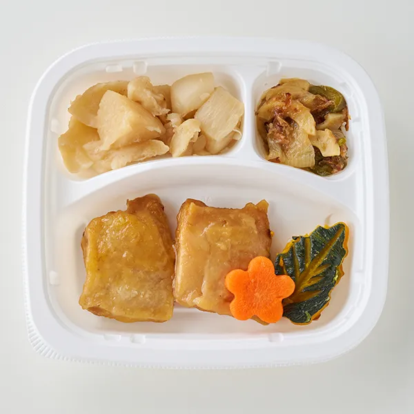 鶏肉の照焼(チキンステーキ(鶏肉、でん粉、濃口醤油、水飴、大豆たんぱく、食塩、大豆油、ブドウ糖、砂糖、にんにく粉末)(中国製造)、三温糖、醤油、みりん、清酒)、かぶの煮物(かぶ、醤油、清酒、本みりん、上白糖、風味調味料)、ちくわ玉葱ピーマンのきんぴら(竹輪、玉ねぎ、ピーマン、本みりん、醤油、食用調合油、鰹節、白ごま)、木の葉南瓜、花人参/リン酸塩(Na)、調味料(アミノ酸等)、pH調整剤、加工澱粉、増粘多糖類、着色料(カラメル)、グリシン、ソルビット、(一部に小麦・ごま・大豆・鶏肉を含む)