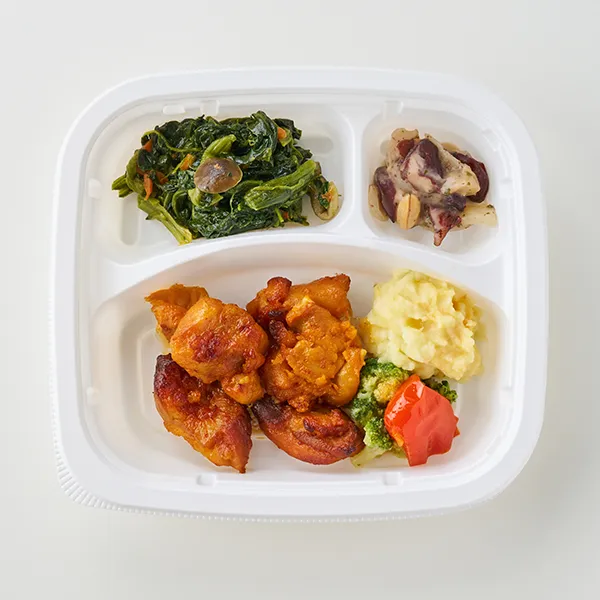 タンドリーチキン(ローストチキン(中国製造)(鶏肉、でん粉、植物性たん白、ぶどう糖、食塩、酵母エキス)、植物油脂、カレー粉、食塩、コリアンダー、クミン、畜肉エキス、たん白加水分解物、脱脂粉乳、ガーリックパウダー、オニオンパウダー、ジンジャーパウダー、唐辛子、胡椒、ヨーグルトパウダー)、青菜のソテー(ほうれん草、ぶなしめじ、人参、食用調合油、ベーコン、醤油、ニンニク、粉末調味料、白コショウ)、大豆・玉葱・パセリのサラダ(玉ねぎ、大豆水煮、赤いんげん豆、オリーブオイル、食塩、ドライパセリ)、マッシュポテト(じゃがいも、牛乳、バターオイル、全粉乳、食塩、香辛料)、ブロッコリー、赤パプリカ/pH調整剤、キシロース、リン酸塩(Na)、調味料(アミノ酸等)、乳化剤、増粘多糖類、加工澱粉、酸化防止剤(アスコルビン酸(Na)、V.E)、くん液、発色剤(亜硝酸Na)、着色料(コチニール、カロチノイド、紅麹)、(一部に小麦・卵・乳成分・大豆・鶏肉・豚肉を含む)
