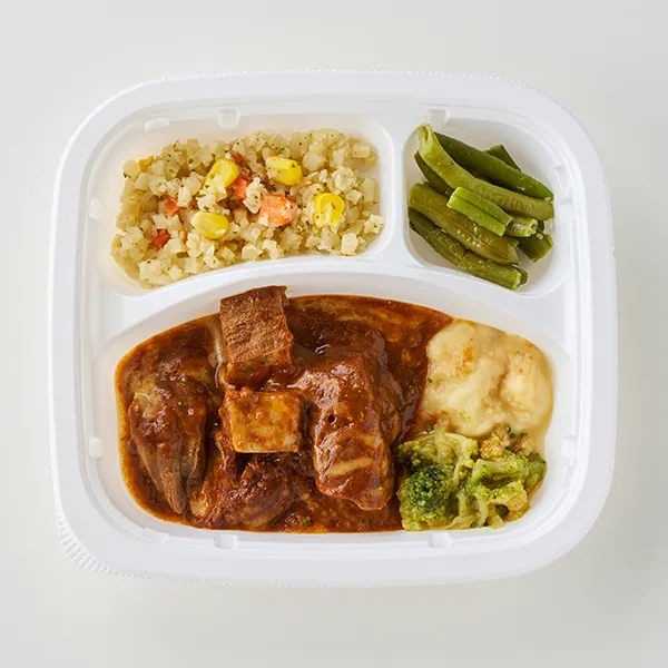 ビーフシチューチーズのせ(ボイルドビーフダイス(国内製造)、デミグラスソース、プロセスチーズ)、カリフラワーライスのピラフ風(カリフラワーライス(ポルトガル)、人参、コーン、オリーブオイル、コンパウンドバター、乾燥スープ(コンソメ)、粉末調味料、ドライパセリ、食塩)、マッシュポテト(じゃがいも、牛乳、バターオイル、全粉乳、食塩、香辛料)、インゲンソテー(インゲン、香味食用油、食塩、白コショウ)、ブロッコリー/増粘剤(加工澱粉)、着色料(カラメル、カロチン)、調味料(アミノ酸等)、乳化剤、セルロース、酸味料、香料、(一部に小麦・乳成分・牛肉・大豆・鶏肉・りんご・ゼラチンを含む)