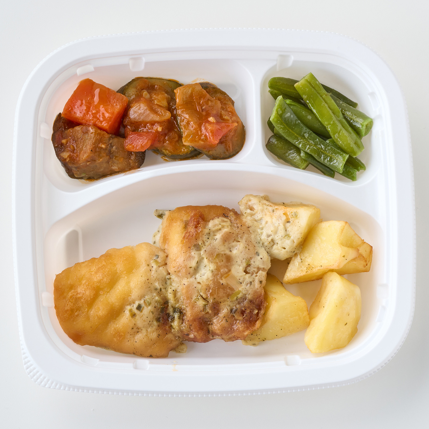 フィッシュアンドチップス(冷凍魚フライ(中国製造)(すけそうだら、揚げ油(パーム油)、小麦粉、コーンフラワー、植物油脂、還元水あめ、食塩、粉末卵白、香辛料、粉末状植物性たん白)、ゆでじゃがいも、半固体状ドレッシング、食用大豆油、きゅうり、玉ねぎ、砂糖・ぶどう糖果糖液糖、オリーブオイル、レモンジュース(濃縮還元)、ニンニク、食塩、醸造酢、黒コショウ、ドライパセリ、香辛料)、ラタトゥイユ(グリルズッキーニ、揚げ茄子、トマトソース、人参、玉ねぎ、トマトケチャップ、白ワイン、食用調合油、オリーブオイル、ハチミツ、乾燥スープ(コンソメ)、ニンニク、粉末調味料、食塩、ローレル)、インゲンソテー(インゲン(インド)、香味食用油、食塩、白コショウ)/調味料(アミノ酸等)、膨張剤、酸味料、増粘剤(増粘多糖類、加工澱粉)、香辛料抽出物、着色料(ウコン、カラメル、カロチン)、明礬、塩化Ca、フィチン酸、香料、加工澱粉、貝Ca、クエン酸(Na)、炭酸Na、重曹、乳化剤、(一部に小麦・卵・乳成分・牛肉・大豆・鶏肉・りんご・ゼラチンを含む)