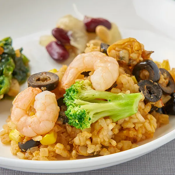 カリフラワーライスをお米に混ぜて糖質に配慮しつつも満足感のあるパエリアが出来上がりました。トマトソースがメインの旨味感じる特製スープで煮詰め仕上げております。