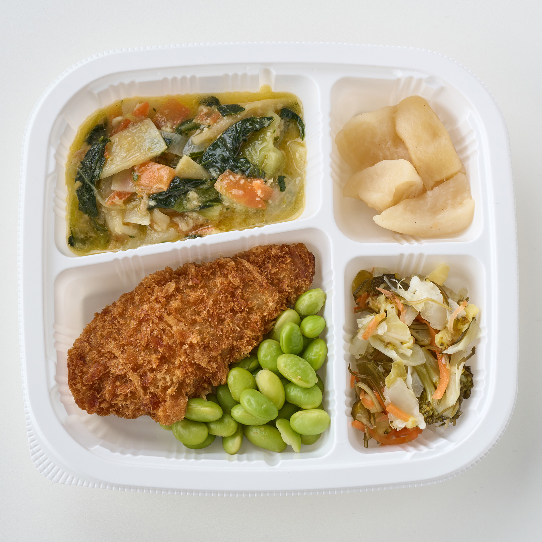 チンゲン菜と筍の炒め物(チンゲン菜(中国)、たけのこ水煮、玉ねぎ、人参、味付ザーサイ、食用調合油、豚肉加工品、清酒、生姜、醤油、ラー油、食塩、白コショウ)、あじメンチカツ(衣(パン粉、小麦粉、米粉、食用油脂、食塩、砂糖、でん粉、香辛料、粉末状大豆たん白)、食用大豆油、野菜(たまねぎ、キャベツ、しょうが)、あじ(国産)、粒状大豆たん白、粉末状大豆たん白、パン粉、しょうゆ、全卵、粉末しょうゆ、砂糖、食塩)、青物の昆布〆(キャベツ、ズッキーニ、ブロッコリー、りんご酢、人参、昆布、食塩、風味調味料)、かぶの煮物(かぶ(インドネシア)、醤油、清酒、本みりん、上白糖、風味調味料)、枝豆煮(枝豆(中国)、醤油、食塩、風味調味料)/加工澱粉、調味料(アミノ酸等)、増粘多糖類、乳化剤、酸味料、酸化防止剤(エリソルビン酸Na)、pH調整剤、保存料(ソルビン酸K)、酢酸、着色料(カロチノイド)、(一部に小麦・卵・ごま・大豆・豚肉・りんごを含む)