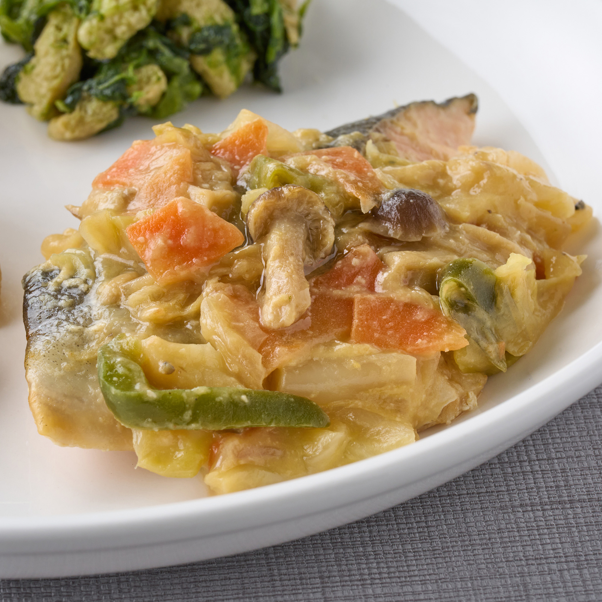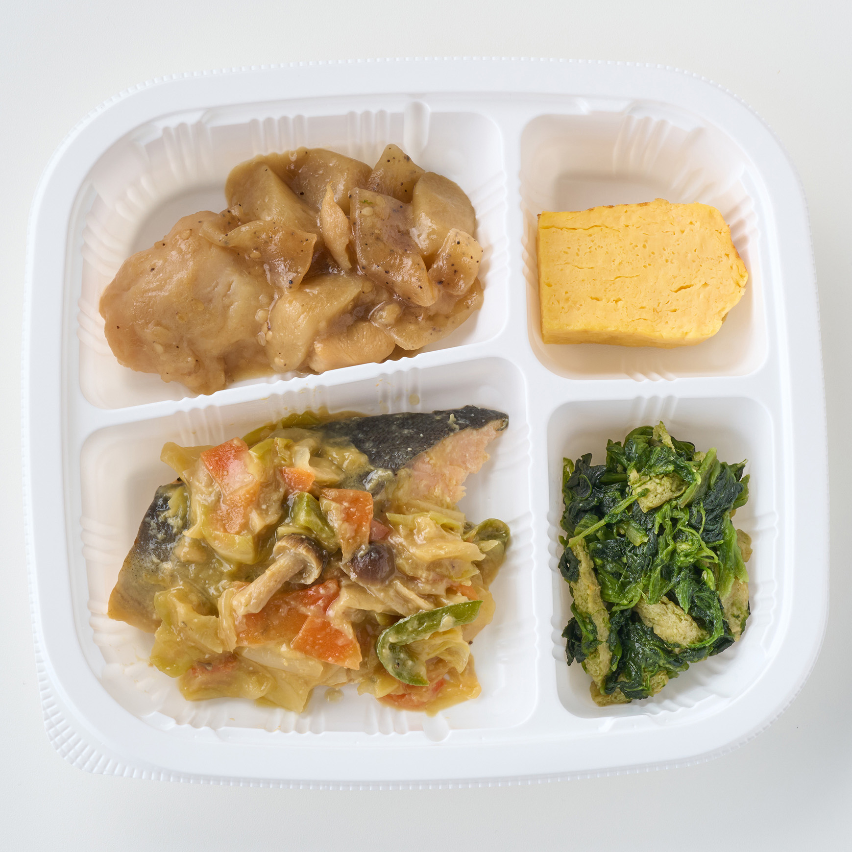 マスのちゃんちゃん焼き(マス(アメリカ)、キャベツ、ピーマン、ぶなしめじ、合わせみそ、人参、コンパウンドバター、ニンニク、清酒、本みりん、上白糖、黒コショウ)、鶏ごぼう(スチームチキン、ごぼう、こんにゃく、煮物つゆ、食用調合油、上白糖、白ごま、食塩)、ほうれん草のおひたし(ほうれん草(中国)、油揚げ、醤油、食塩、風味調味料)、だし巻き玉子(国内製造)(鶏卵、砂糖、しょうゆ、発酵調味液、でん粉、果糖ブドウ糖液糖、食塩、リンゴ酢、大豆油)/加工澱粉、安定剤(加工澱粉)、pH調整剤、調味料(アミノ酸等)、増粘多糖類、ポリリン酸Na、水酸化カルシウム、着色料(カラメル、カロチン)、豆腐用凝固剤、乳化剤、香料、(一部に小麦・卵・乳成分・ごま・さけ・大豆・鶏肉・りんごを含む)
