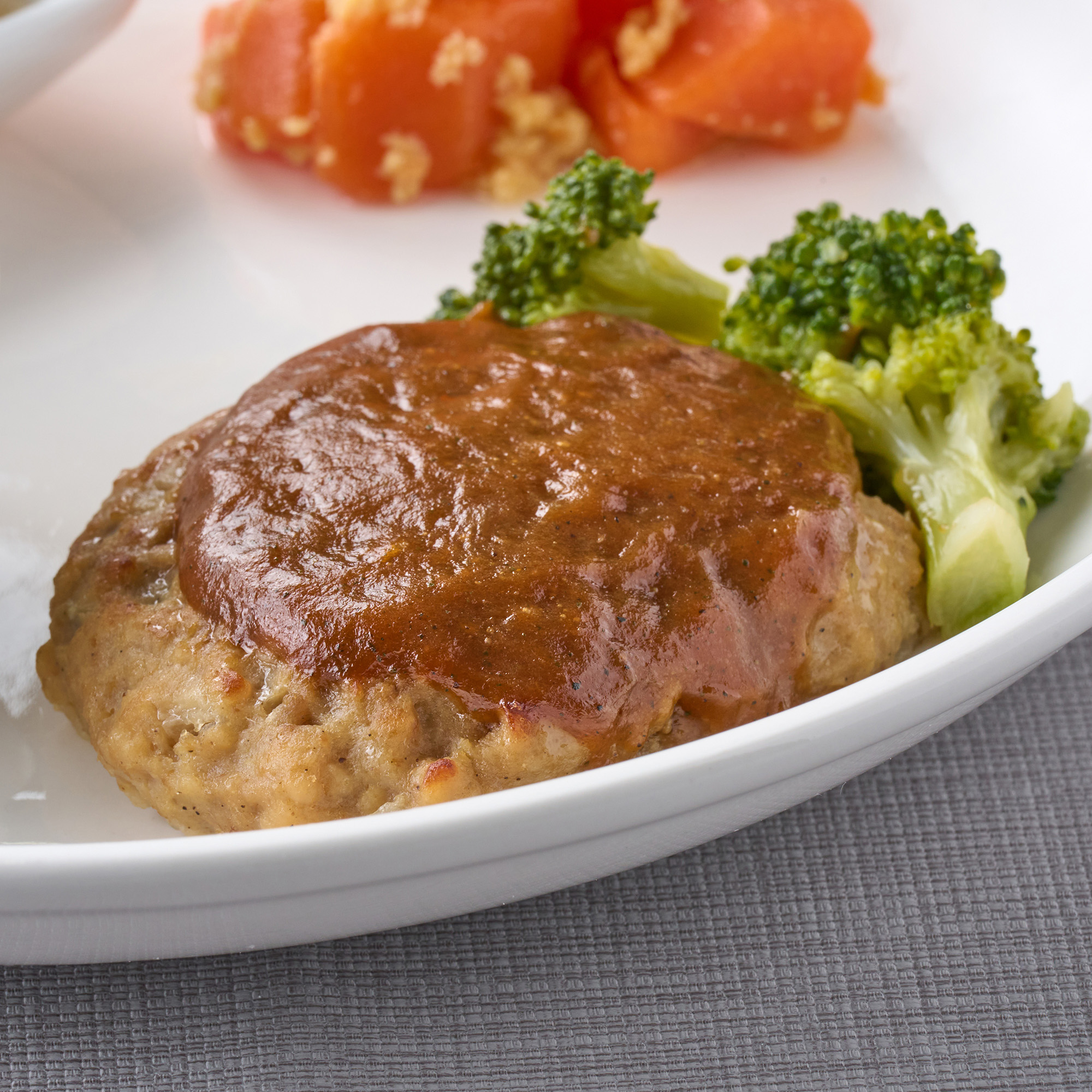 ハンバーグデミグラスソース(ハンバーグ(国内製造)、デミグラスソース、オニオンソテー、ウスターソース、赤ワイン、食用調合油、醤油、粉末調味料、コンパウンドバター、ニンニク、黒コショウ、ホーリーバジル)、大豆・ナス・ピーマンの温サラダ(揚げなす、大豆水煮、ピーマン、赤ピーマン、半固体状ドレッシング、食用調合油、醸造酢、食塩)、もやしのナムル(もやし(国産)、食用調合油、食塩、白コショウ)、人参と玉子の炊き合わせ(人参、全卵、グラニュー糖、コンパウンドバター、食塩)、茹でブロッコリー(ブロッコリー、醤油、食塩、風味調味料)/調味料(有機酸等)、糊料(加工澱粉、増粘多糖類)、着色料(カラメル、カロチン)、リン酸塩(Na)、酸化防止剤(V.C)、乳化剤、香料、加工澱粉、香辛料抽出物、(一部に小麦・卵・乳成分・牛肉・ごま・大豆・鶏肉・豚肉・りんご・ゼラチンを含む)