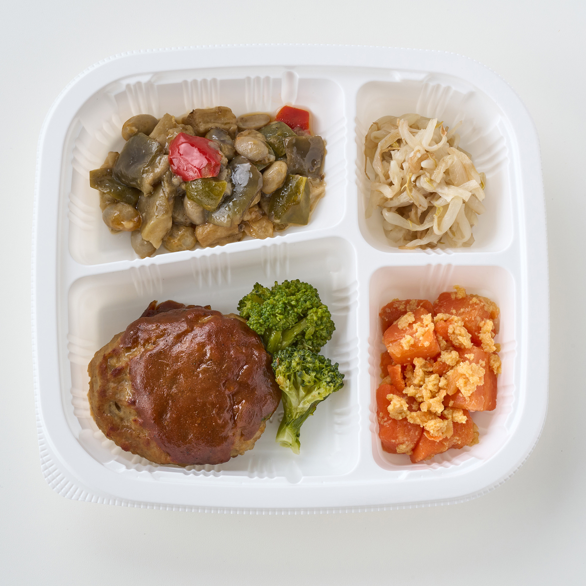 ハンバーグデミグラスソース、大豆・ナス・ピーマンの温サラダ、人参と玉子の炊き合わせ、もやしのナムル、茹でブロッコリー