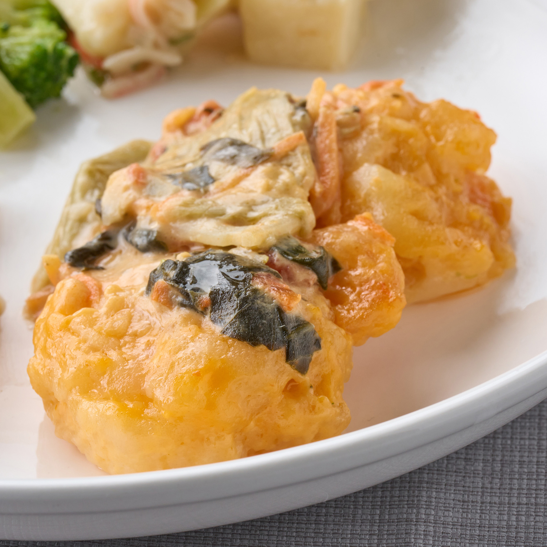 野菜たっぷりエビマヨ(えびフリッター(マヨネーズソース)(タイ製造)(えび、マヨネーズソース(大豆油、砂糖、食酢、トマトペースト、卵黄、食塩、ライムジュース、酵母エキス、香辛料)、衣(小麦粉、食塩、植物油脂)、揚げ油(パーム油)、食塩)、小松菜(中国)、半固体状ドレッシング、れんこん水煮、トマト・ピューレー、人参(国産)、上白糖、食用調合油、ニンニク、生姜、食塩)、鶏と大根の味噌煮(大根(国産)、スチームチキン、味噌だれ、醤油、コチジャン、食塩)、豆腐のかにあんかけ(冷凍豆腐、長葱、かに風味蒲鉾、食用調合油、醤油、生姜、食塩、粉末調味料)、ブロッコリーソテー(ブロッコリー(エクアドル)、食用調合油、コンパウンドバター、食塩、白コショウ)/加工澱粉、増粘剤(加工澱粉、増粘多糖類)、調味料(アミノ酸等)、リン酸塩(Na)、豆腐用凝固剤、pH調整剤、着色料(カロチノイド、紅麹、V.B2)、膨張剤、香料、炭酸Ca、酸化防止剤(V.C)、乳化剤、漂白剤(亜硫酸塩)、香辛料抽出物、(一部にえび・かに・小麦・卵・乳成分・ごま・大豆・鶏肉・りんご・ゼラチン・魚醤パウダー(魚介類)を含む)