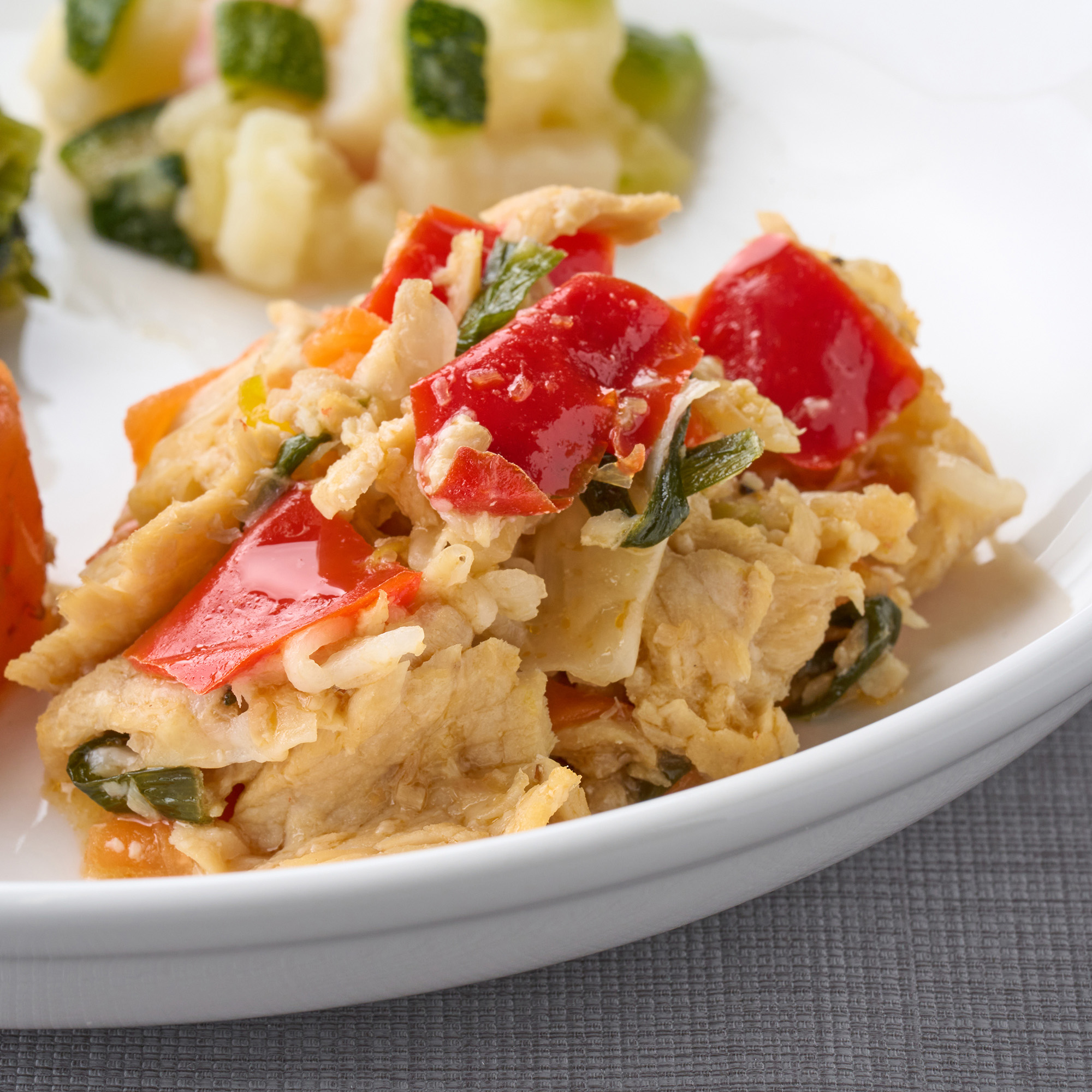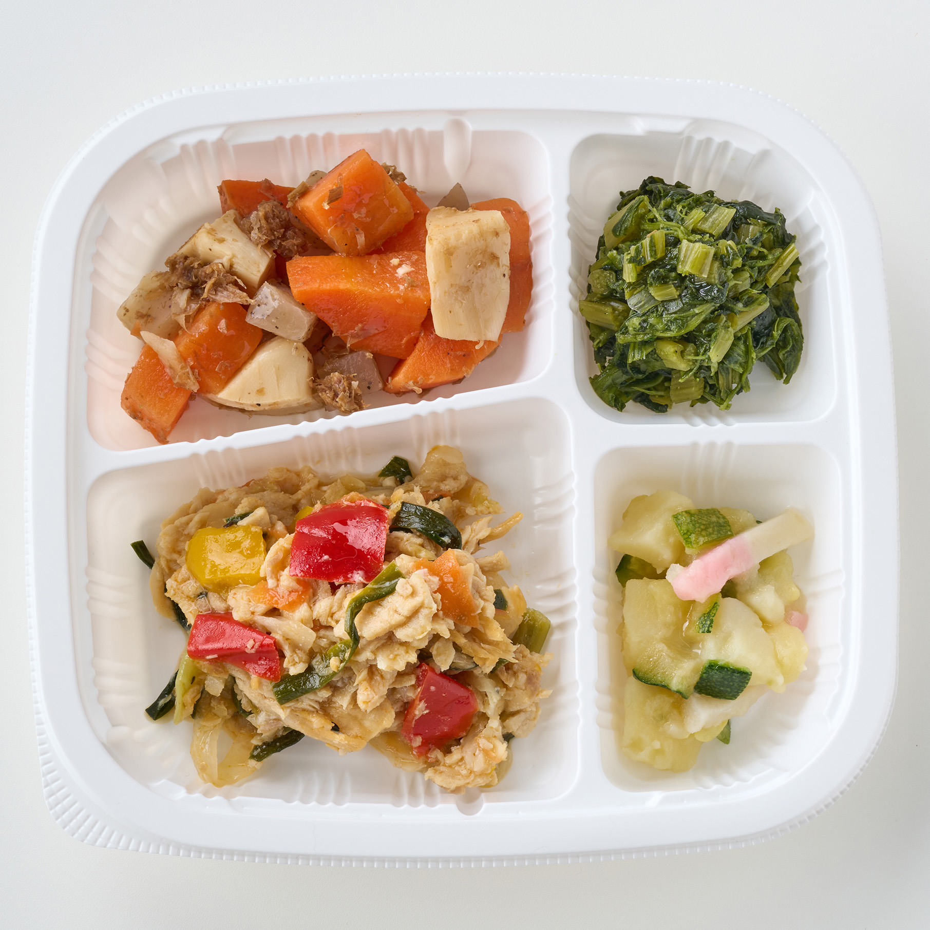 豚と野菜の塩麹炒め(豚肉加工品(国内製造)、キャベツ(国産)、米こうじ加工品、ニラ(中国)、赤ピーマン(中国)、黄ピーマン(中国)、玉ねぎ(中国)、人参(国産)、食用調合油、清酒、粉末調味料、食塩、上白糖、黒コショウ)、人参・筍・こんにゃくの土佐煮(人参(国産)、こんにゃく(国内製造)、たけのこ水煮、醤油、上白糖、鰹節)、ズッキーニのみぞれ和え(ズッキーニ、ゆでじゃがいも、かまぼこ、煮物つゆ、食用調合油、乾燥大根パウダー、生姜、食塩)、青菜炒め(葉だいこん、ほうれん草、食用調合油、みりん、醤油、食塩)/安定剤(加工澱粉)、加工澱粉、調味料(アミノ酸等)、pH調整剤、増粘多糖類、水酸化カルシウム、着色料(カラメル、コチニール)、酒精、(一部に小麦・大豆・鶏肉・豚肉を含む)