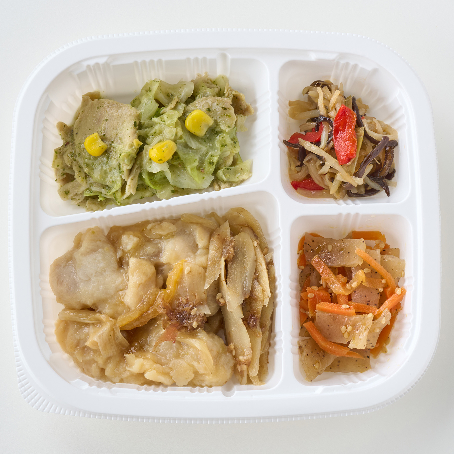 鶏の柚子胡椒焼き(スチームチキン(中国製造)、玉ねぎ、長葱、みりん、醤油、柚子こしょう、食用調合油、ゆず、生姜、食塩)、野菜のバジル炒め(キャベツ(国産)、豚肉加工品、玉ねぎ、コーン、バジルペースト、食用調合油、食塩、黒コショウ)、こんにゃくきんぴら(こんにゃく、人参、食用調合油、煮物つゆ、白ごま、上白糖、ナンプラー、食塩)、もやしとザーサイ炒め(もやし(国産)、味付ザーサイ、赤ピーマン、食用調合油、オイスターソース、きくらげ、清酒、ラーメンスープ、食塩、生姜)、牛蒡煮(ごぼう、煮物つゆ、鰹節、白ごま、上白糖、食塩)/加工澱粉、安定剤(加工澱粉)、ポリリン酸Na、増粘剤(増粘多糖類、加工澱粉)、調味料(アミノ酸等)、pH調整剤、水酸化カルシウム、着色料(カラメル、カロチノイド、クチナシ)、酸味料、焼成Ca、酸化防止剤(エリソルビン酸Na)、香料、保存料(ソルビン酸K)、香辛料抽出物、(一部にえび・小麦・乳成分・ごま・大豆・鶏肉・豚肉・りんごを含む)