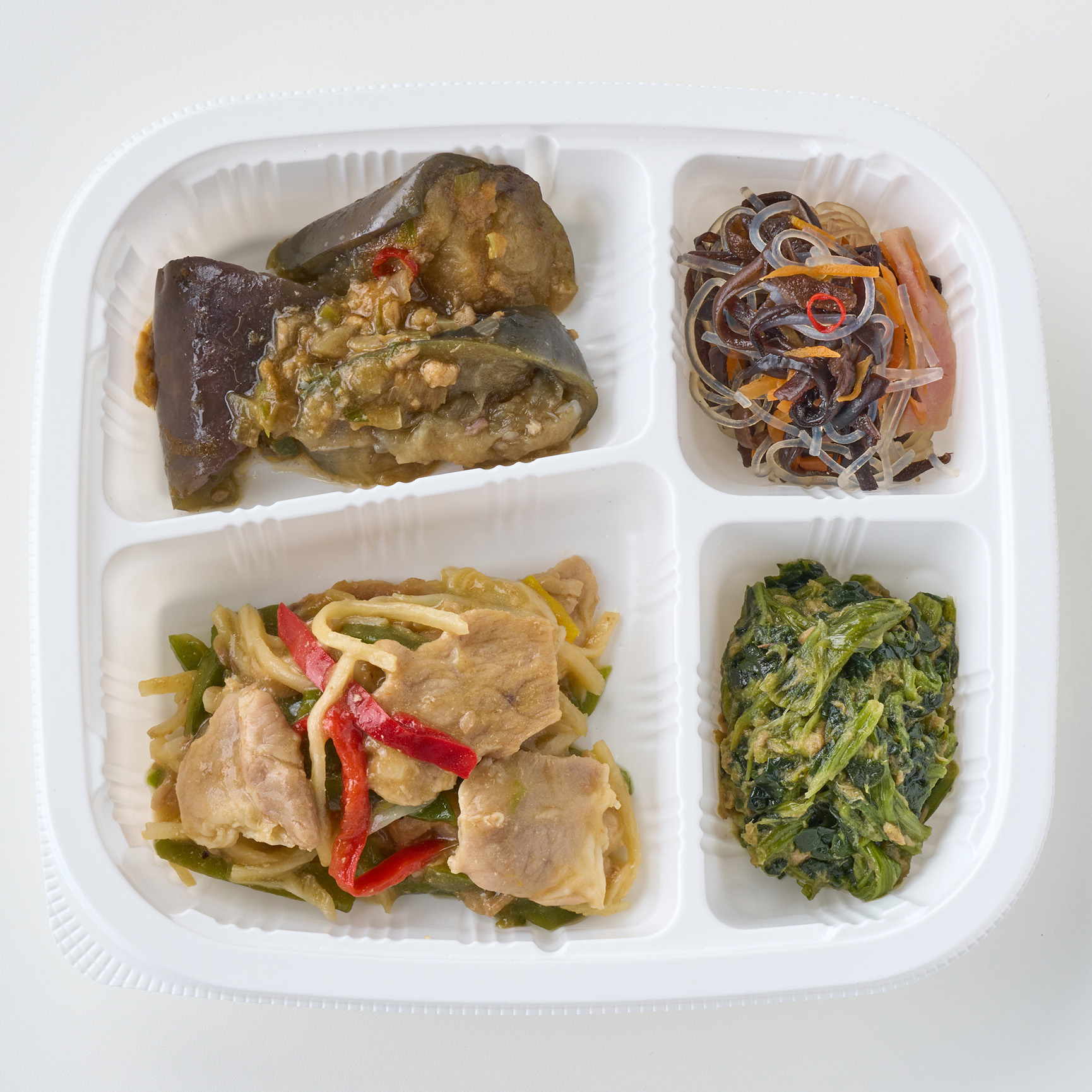 青椒肉絲(ピーマン(中国)(緑、黄、赤)、豚肉、たけのこ水煮、もやし、食用調合油、醤油、清酒、上白糖、オイスターソース、XO醤、食塩、黒コショウ)、マーボーナス(揚げ茄子(中国製造)、豚肉加工品、玉ねぎ、長葱、中華調味料(しょうゆ、豆板醤、かきエキス、砂糖、米みそ、にんにく、食塩、醸造酢、香味食用油、発酵調味料、しょうが、トウチ醤、ごま油、魚醤)、食用調合油、食塩、鷹の爪)、ほうれん草のツナ和え(ほうれん草(中国)、ツナフレーク、食用調合油、醤油、食塩、白コショウ)、きくらげの酢の物(ハム、人参、醸造酢、上白糖、きくらげ、春雨、醤油、生姜、食塩、風味調味料、鷹の爪)/増粘剤(増粘多糖類、加工澱粉)、調味料(アミノ酸等)、加工澱粉、リン酸塩(Na)、酢酸Na、着色料(カラメル、コチニール、カロチノイド)、pH調整剤、酸化防止剤(V.C)、発色剤(亜硝酸Na)、香料、酸味料、くん液、香辛料抽出物、(一部にえび・小麦・卵・乳成分・ごま・大豆・豚肉を含む)