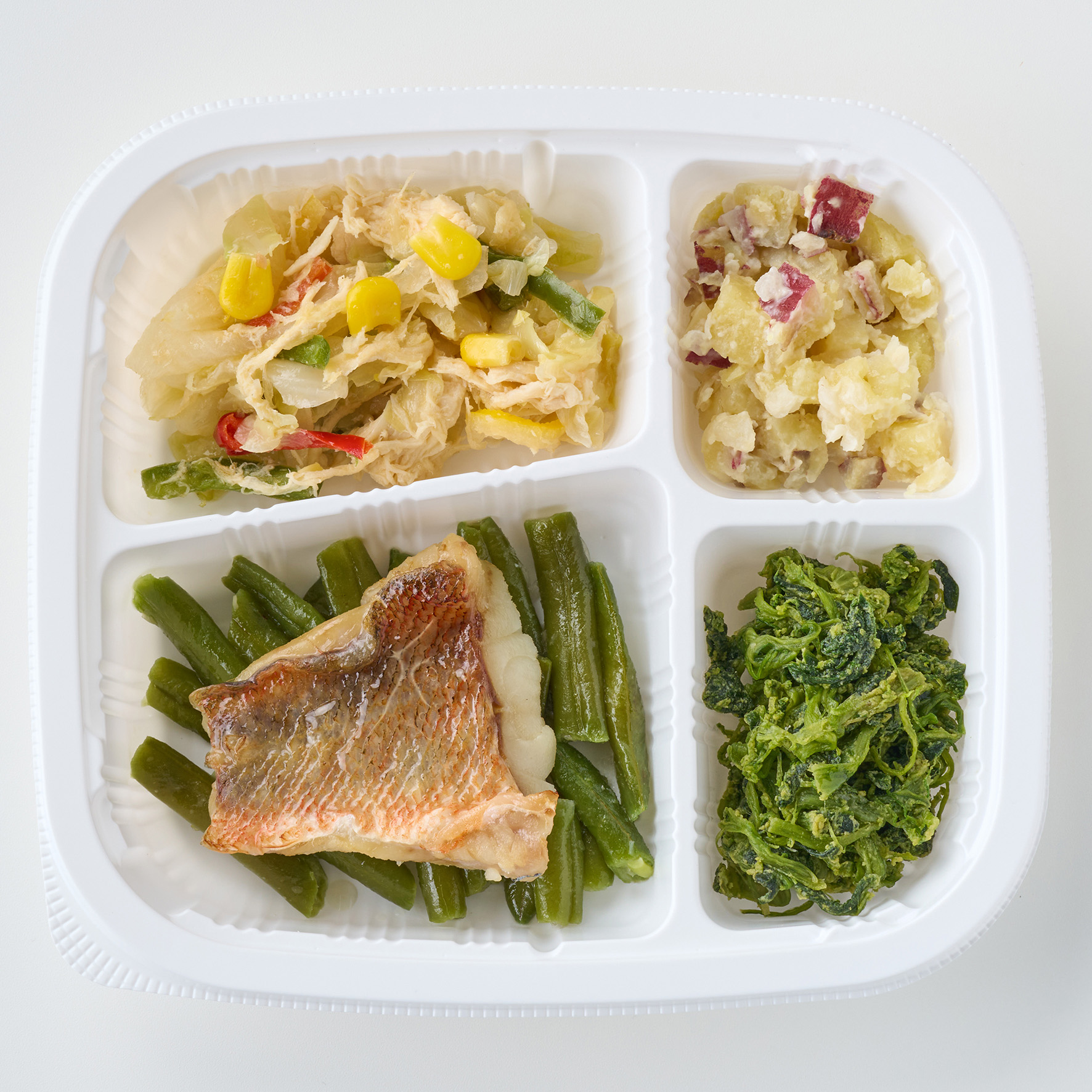 野菜の柚子胡椒炒め(玉ねぎ(中国)、キャベツ、蒸し鶏、コーン、ピーマン、赤ピーマン、食用調合油、食塩、ゆず、柚子こしょう)、赤魚の塩焼き(赤魚(アメリカ)、食塩)、さつま芋サラダ(さつま芋(国産)、玉ねぎ、ヨーグルト、半固体状ドレッシング、上白糖、食塩)、ほうれん草の菜種和え(ほうれん草、全卵、煮物つゆ、食用調合油、食塩)、インゲンソテー(インゲン、香味食用油、食塩、白コショウ)/酢酸塩(Na、Ca)、グリシン、調味料(アミノ酸等)、リン酸塩(Na)、グリセリンエステル、安定剤(増粘多糖類)、香料、着色料(カラメル、クチナシ、カロチン)、増粘剤(加工澱粉、増粘多糖類)、乳化剤、香辛料抽出物、(一部に小麦・卵・乳成分・ごま・大豆・鶏肉・りんご・ゼラチンを含む)