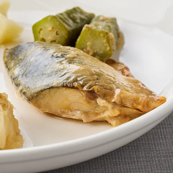 サバの味噌だれがけ(さば切身(中国製造)、白みそ、清酒、醤油、本みりん、上白糖、生姜)、野菜の柚子胡椒炒め(玉ねぎ(中国)、キャベツ、蒸し鶏、コーン、ピーマン、赤ピーマン、食用調合油、食塩、ゆず、柚子こしょう)、ポテトソテー(ゆでじゃがいも、香味食用油、食用調合油、食塩、白コショウ)、筍の土佐煮(たけのこ水煮、醤油、上白糖、鰹節、食塩)、オクラの胡麻和え(オクラ、ごま和えの素、食塩)/増粘多糖類、pH調整剤、トレハロース、調味料(アミノ酸)、リン酸塩(Na)、香料、着色料(クチナシ、カロチン)、乳化剤、(一部に小麦・乳成分・ごま・さば・大豆・鶏肉を含む)
