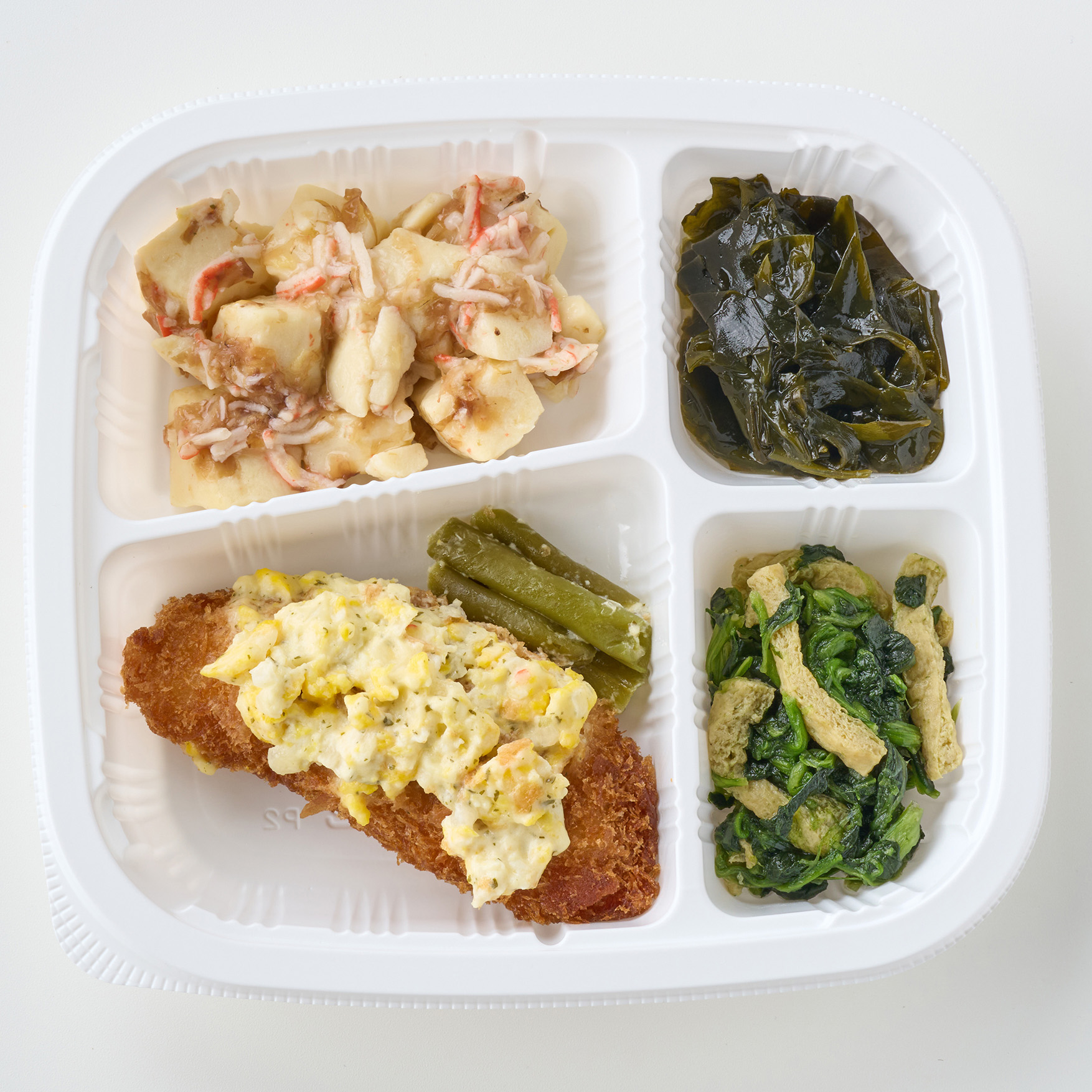 サーモンフライ(サーモンフライ(国内製造)(カラフトマス(ロシア)、パン粉、小麦粉、植物油脂、しょうゆ、でん粉、小麦粉加工品、しょうがペースト、食塩、砂糖)、食用大豆油、ヨーグルト、半固体状ドレッシング、玉ねぎ、スクランブルエッグ、上白糖、オリーブオイル、レモンジュース(濃縮還元)、ニンニク、食塩、ドライパセリ)、豆腐の煮やっこ(冷凍豆腐、かに風味蒲鉾、煮物つゆ、生姜、鰹節、食塩)、ほうれん草のおひたし(ほうれん草(中国)、油揚げ、醤油、食塩、風味調味料)、ワカメの青ジソサラダ(ドレッシングタイプ調味料、乾燥ワカメ)、インゲン煮(インゲン、醤油、食塩、風味調味料)/加工澱粉、調味料(アミノ酸等)、豆腐用凝固剤、増粘剤(増粘多糖類、加工澱粉)、膨張剤、着色料(紅麹、カロチノイド、カラメル)、ピロリン酸Na、香料、安定剤(増粘多糖類)、炭酸Ca、乳化剤、甘味料(スクラロース)、pH調整剤、香辛料抽出物、(一部にかに・小麦・卵・乳成分・さけ・大豆・りんご・ゼラチンを含む)