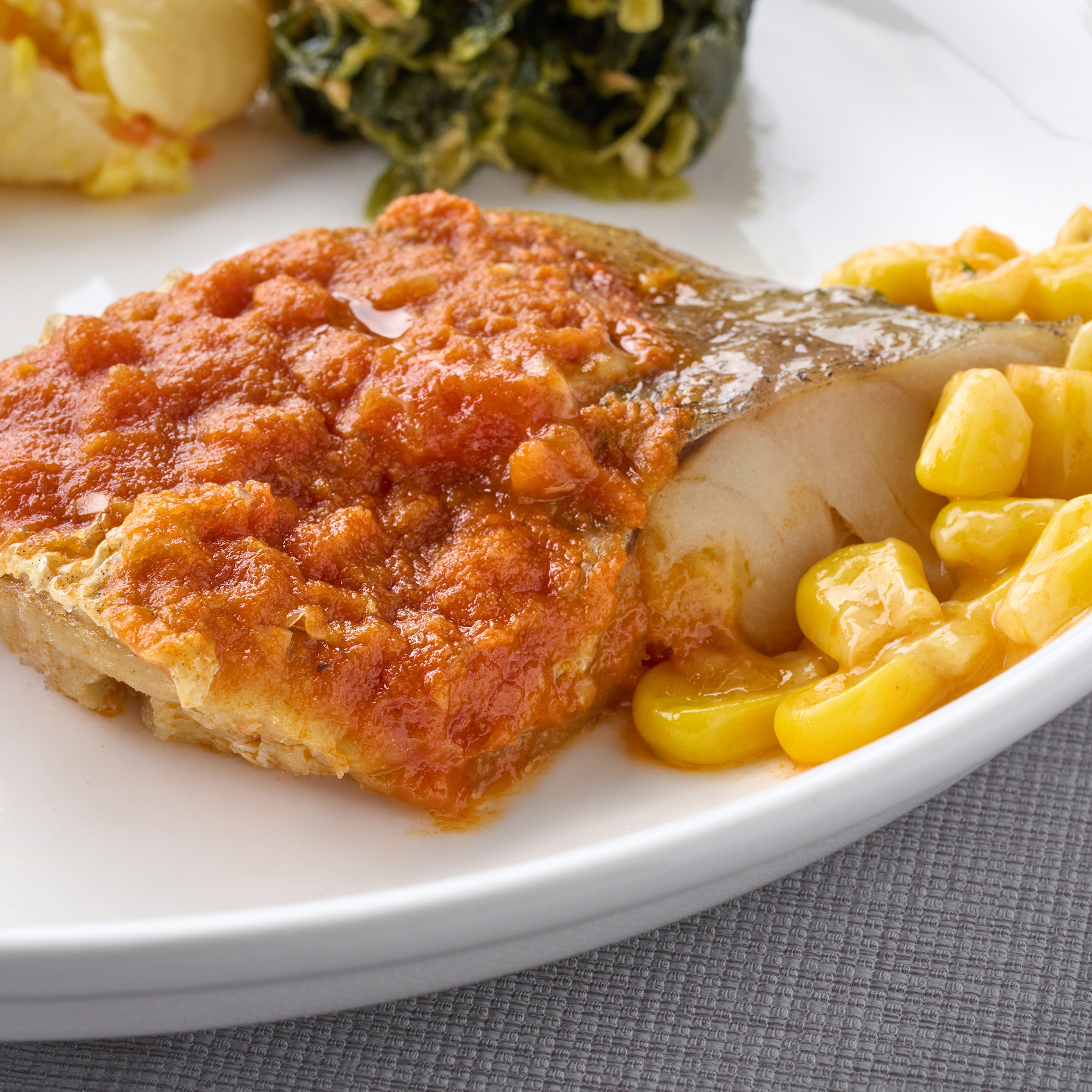 ふっくらと焼き上げたタラに、ガーリック風味の特製トマトソースを合わせました。