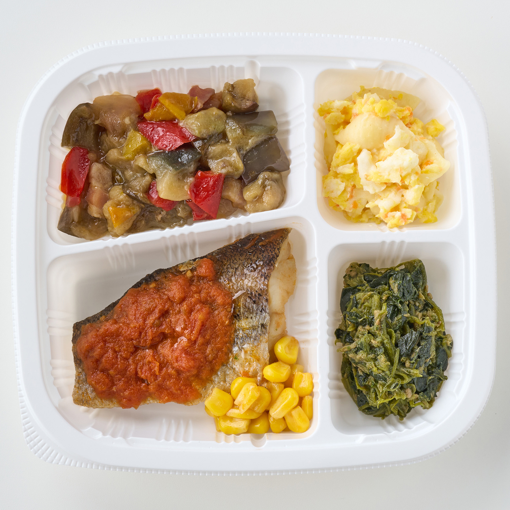タラのトマトソース、ナスとベーコンの塩炒め、ほうれん草のツナ和え、タマゴサラダ、コーンのバター風味