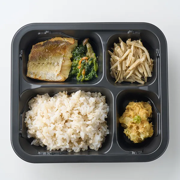 麦ごはん(うるち米(国産)、米粒麦、食用油脂)、タラの白醤油焼き(助宗タラ(ロシア)、白醤油、みりん、砂糖、食塩)、ごぼうサラダ(ごぼう(中国)、ごまドレッシング、半固体状ドレッシング、食用調合油、みりん、醤油、食塩)、ポテトのツナマヨカレーソース(ゆでじゃがいも、半固体状ドレッシング、ツナフレーク、グリーンピース、食用調合油、カレールウ、上白糖、香味食用油、食塩)、青菜のソテー(ほうれん草、ぶなしめじ、人参、食用調合油、ベーコン、醤油、ニンニク、粉末調味料、白コショウ)/酢酸塩(Na、Ca)、調味料(アミノ酸等)、グリシン、着色料(カラメル、コチニール、カロチン)、グリセリンエステル、増粘剤(増粘多糖類、加工澱粉)、加工澱粉、リン酸塩(Na)、くん液、酸化防止剤(V.C)、発色剤(亜硝酸Na)、香辛料抽出物、香料、乳化剤、酸味料、(一部に小麦・卵・乳成分・ごま・大豆・鶏肉・豚肉・りんご・ゼラチンを含む)