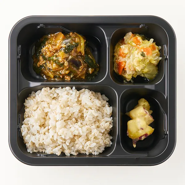 麦ごはん(うるち米(国産)、米粒麦(国産)、食用油脂)、牛肉と茄子の麻婆ソース(牛肉加工品(国内製造)、小松菜、揚げなす、中華調味料(しょうゆ、豆板醤、かきエキス、砂糖、米みそ、にんにく、食塩、醸造酢、香味食用油、発酵調味料、しょうが、トウチ醤、ごま油、魚醤)、食用調合油、甜麺醤、ニンニク、生姜)、白菜とミンチの中華炒め(白菜(国産)、スチームチキン、玉ねぎ、人参、食用調合油、食塩、粉末調味料)、さつま芋のバター風味(さつまいも、クリーム、上白糖、牛乳、半固体状ドレッシング、バター、ハチミツ、調味酢、食塩)/加工澱粉、調味料(アミノ酸等)、増粘剤(増粘多糖類、加工澱粉)、着色料(カラメル、カロチノイド)、pH調整剤、ポリリン酸Na、焼成Ca、酸味料、香辛料抽出物、(一部に小麦・卵・乳成分・落花生・牛肉・ごま・大豆・鶏肉・りんご・ゼラチンを含む)