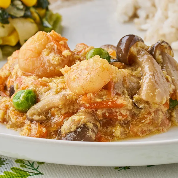 海老としめじを甘辛く煮込み、玉子でとじた一品です。旨味が広がるしっかりした味付けで、ごはんが進みます。