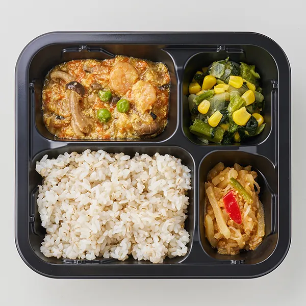 麦ごはん(うるち米(国産)、米粒麦(国産)、食用油脂)、海老としめじの玉子とじ(海老、ぶなしめじ(国産)、玉ねぎ、全卵、人参、煮物つゆ、グリーンピース、食用調合油、食塩、粉末調味料)、チンゲン菜とコーンの中華炒め(チンゲン菜(中国)、玉ねぎ、コーン、食用調合油、清酒、みりん、オイスターソース、ニンニク、粉末調味料、食塩、白コショウ)、糸コンとじゃが芋の味噌炒め(じゃが芋、糸こんにゃく、ピーマン、赤ピーマン、白みそ、食用調合油、白ごま、本みりん、ニンニク)/加工澱粉、調味料(アミノ酸等)、増粘剤(増粘多糖類、加工澱粉)、酢酸塩(Na、Ca)、pH調整剤、グリシン、着色料(カラメル)、水酸化カルシウム、グリセリンエステル、香料、(一部にえび・小麦・卵・ごま・大豆・鶏肉・ゼラチン・魚醤パウダー(魚介類)を含む)