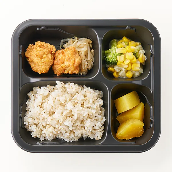 麦ごはん(うるち米(国産)、米粒麦、食用油脂)、鶏の唐揚げ(鶏肉(中国)、でんぷん、しょうゆ、しょうが、清酒、砂糖、にんにく、大豆たんぱく、小麦粉、食塩、大豆油(揚げ油))、温野菜サラダ(カリフラワー、ブロッコリー、コーン、半固体状ドレッシング、フレンチドレッシング、食塩)、さつま芋の甘露煮(さつまいも(インドネシア)、みりん、上白糖、食塩)、もやしのナムル(もやし、食用調合油、食塩、白コショウ)/pH調整剤、加工澱粉、調味料(アミノ酸等)、ポリリン酸Na、キシロース、増粘剤(増粘多糖類、加工澱粉)、甘味料(ステビア)、香辛料抽出物、(一部に小麦・卵・乳成分・ごま・大豆・鶏肉・りんご・ゼラチンを含む)