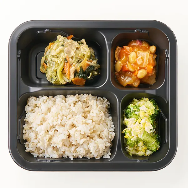 麦ごはん(うるち米(国産)、米粒麦、食用油脂)、豚肉とチンゲン菜の塩炒め(チンゲン菜(中国)、豚肉加工品(国内製造)、もやし、玉ねぎ、人参、長葱、食用調合油、清酒、ラーメンスープ、ニンニク、食塩、粉末調味料、チキンブイヨン、白コショウ)、野菜入りトマトビーンズ(大豆水煮、玉ねぎ、人参、トマトソース、オリーブオイル、ベーコン、白ワイン、ニンニク、チキンブイヨン、食塩)、ミモザサラダ(ブロッコリー、スクランブルエッグ、フレンチドレッシング、食塩)/加工澱粉、増粘剤(増粘多糖類、加工澱粉)、調味料(アミノ酸等)、リン酸塩(Na)、焼成Ca、酸化防止剤(アスコルビン酸(Na))、乳化剤、塩化Ca、甘味料(ステビア)、香辛料抽出物、pH調整剤、着色料(カラメル)、香料、くん液、発色剤(亜硝酸Na)、(一部に小麦・卵・乳成分・ごま・大豆・鶏肉・豚肉・りんご・ゼラチンを含む)