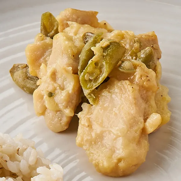 蒸し焼きにした鶏肉と味噌だれをあわせました。彩りのアクセントとしてインゲンを加えてみました。