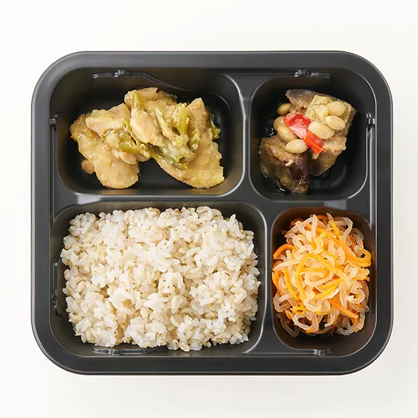 麦ごはん(うるち米(国産)、米粒麦、食用油脂)、鶏肉とインゲンの味噌だれ焼き(スチームチキン(中国製造)、いんげん(中国)、みりん、長葱、合わせみそ、食用調合油、白ごま、食塩)、大豆・ナス・ピーマンの温サラダ(揚げ茄子、大豆水煮、赤ピーマン、ピーマン、半固体状ドレッシング、食用調合油、食塩、醸造酢)、ピリ辛こんにゃく(糸こんにゃく、人参、食用調合油、煮物つゆ、白ごま、三温糖、ナンプラー、食塩、鷹の爪)/加工澱粉、ポリリン酸Na、pH調整剤、増粘剤(増粘多糖類、加工澱粉)、調味料(アミノ酸等)、水酸化カルシウム、酸化防止剤(V.C)、着色料(カラメル)、香辛料抽出物、(一部に小麦・卵・乳成分・ごま・大豆・鶏肉・りんご・ゼラチンを含む)