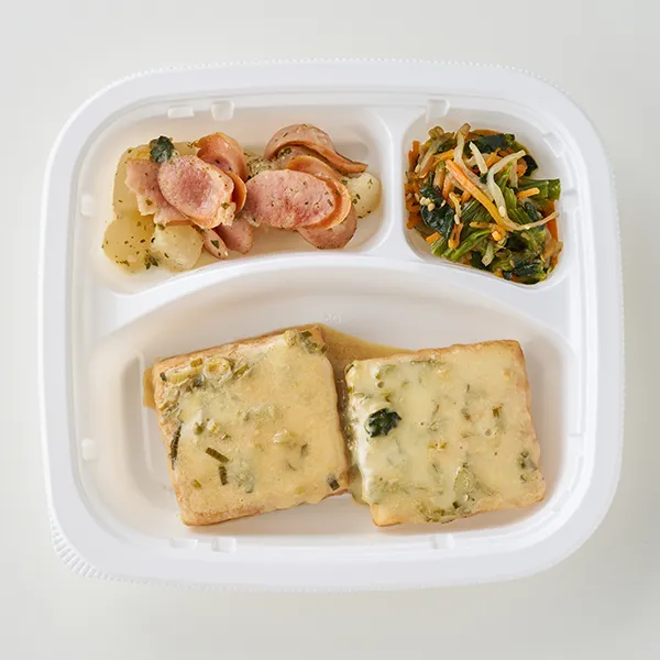 厚揚げのネギ味噌チーズ(厚揚げ(国内製造)、プロセスチーズ、半固体状ドレッシング、ねぎ、合わせみそ、本みりん、醤油)、大根とウインナーのコンソメ煮(だいこん、ウインナーソーセージ、乾燥スープ(コンソメ)、ドライパセリ、黒コショウ)、3色ナムル(ほうれん草、緑豆もやし、にんじん、食用調合油、醤油、白ごま)/加工澱粉、豆腐用凝固剤、調味料(アミノ酸等)、乳化剤、セルロース、酸味料、リン酸塩(Na)、酸化防止剤(V.C)、pH調整剤、増粘剤(加工澱粉、増粘多糖類)、発色剤(亜硝酸Na)、着色料(コチニール、カラメル)、香辛料抽出物、(一部に小麦・卵・乳成分・牛肉・ごま・大豆・鶏肉・豚肉・りんご・ゼラチンを含む)